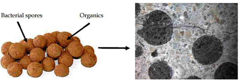משמאל – תמונת מיקרוסקופ של חלקיקי חרסית נקבוביים (הספוגים בסידן לקטטי) שביניהם מפוזרים נבגים של החיידקים לפני הכנסתם לבטון. מימין: תמונת מיקרוסקופ של אותם חלקיקים כשהם משולבים בבטון.